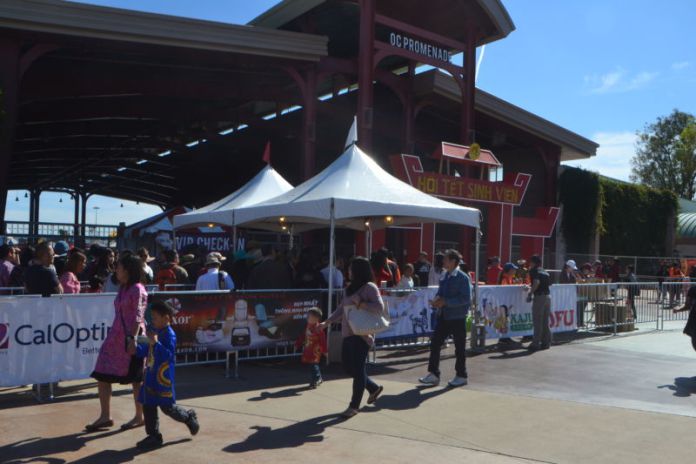 Dù phải tốn $8 để đậu xe, bãi xe của hội chợ này chật kín và dòng xe ra vào vẫn rất dài. Còn dòng người tại lối vào hội chợ thì đông đúc, ai cũng phấn khích để chuẩn bị được thưởng thức các món ăn ngon, tham gia các trò chơi liên quan đến văn hóa Việt và xem các màn văn nghệ hấp dẫn.
