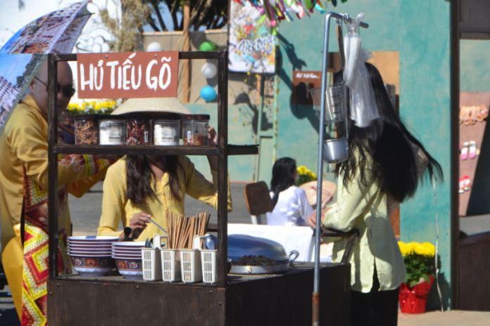 Các sinh viên tại một mô hình xe bán hủ tiếu gõ ở hội chợ tại OC Fair. (Hình: Thiện Lê/NV)