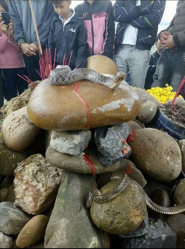 +2 con rắn nước này một to, một nhỏ. Con nhỏ như là con đực, con to là con cái, nó dường như đang chuẩn bị sinh nở. Vì hồi nhỏ ở quê tui hay đi bắt rắn nên biết tí chút. Rắn nước thấy cái chỗ nhiều hốc như hang do đá cuội con người tạo ra thì tìm đến làm tổ thôi. Gần tết, trong tết đến giờ ấm hơn mấy ngày rét cắt da, lại có ngày hửng nắng thì rắn bò ra sưởi. Thế là bà con lại thắp nến, khói hương trầm trồ. Thắp một hồi mùi hương nồng nặc, đổ nước suối lên đầu rắn vô thiên, thế là con rắn đực đã chết. Có người khóc tu tu vì sao ông rắn qua đời.