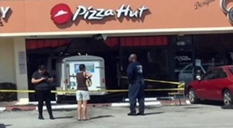Tài xế bị lạc tay lái, lao xe van thẳng vào cửa tiệm Pizza Hut tại Fort Lauderdale vào chiều thứ Sáu. (WPLG 10)