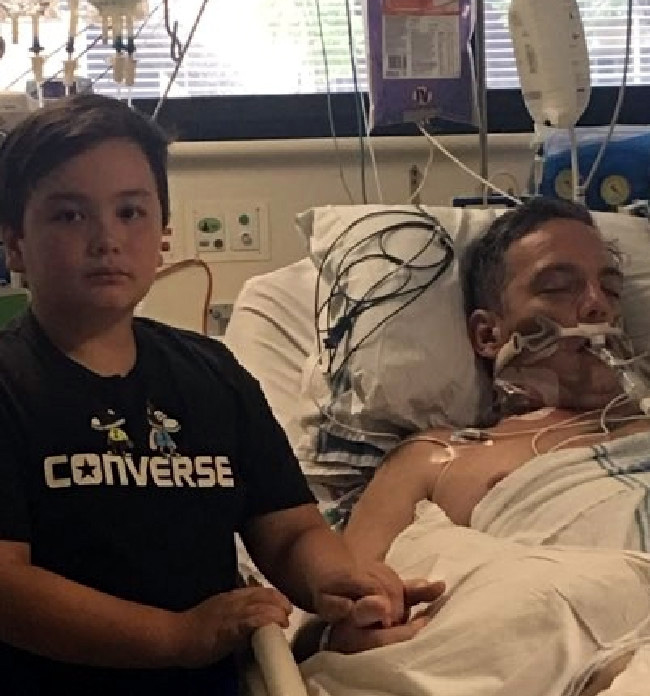 Ông Russell Marsh đang phấn đấu cho mạng sống trong bệnh viện trong hơn hai tuần qua, với con trai đứng bên cạnh giường bệnh. (Hình: GoFundMe)