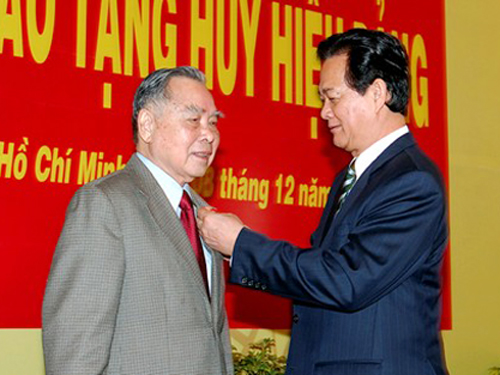 Cuối năm 2014, ông Nguyễn Tấn Dũng lúc đó là Thủ tướng Chính phủ đã trao Huy hiệu 55 năm tuổi Đảng cho nguyên Thủ tướng Phan Văn Khải. (Ảnh: IT)