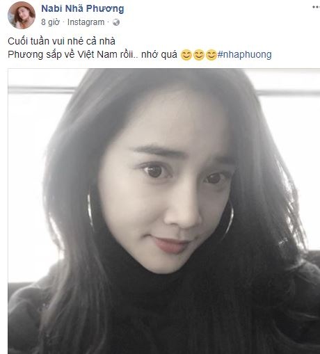 Tuy nhiên, việc Nhã Phương chia sẻ không hề liên quan đến chuyện tình cảm của bạn trai và Nam Em. Cô chúc mọi người có một cuối tuần vui vẻ và cho biết sắp trở về Việt Nam. Kèm theo đó là hình ảnh nữ diễn viên cười mỉm, để tóc xõa nhẹ nhàng.