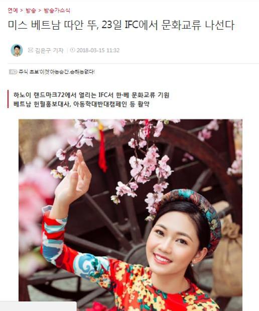 Mới đây, á hậu được trang Edaily (top 3 làng báo xứ kim chi) dành hẳn một bài viết để giới thiệu. Bài viết dành những lời khen về nhan sắc, các hoạt động ý nghĩa của Á hậu Việt Nam thời gian qua như quảng bá văn hóa, đấu tranh chống lạm dụng tình dục trẻ em... Tác giả đã giới thiệu "nàng hậu" như một đại sứ văn hóa xã hội của Việt Nam.