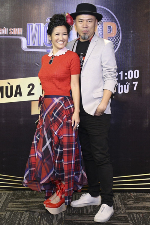 Hồng Nhung chọn cho mình thiết kế đầm dài “dìm dáng”, kết hợp cùng đôi giày đế xuồng thô kệch và nhất là mái tóc rối bời, cài thêm đoá hoa to gần bằng khuôn mặt.