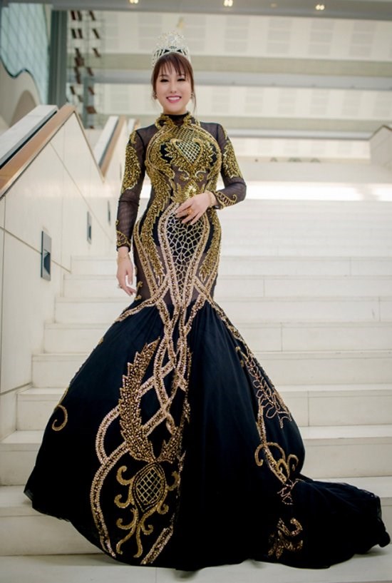 Bộ váy dạ hội cồng kềnh cùng họa tiết rối rắm làm cho Phi Thanh Vân trở nên nặng nề và kém thanh lịch.