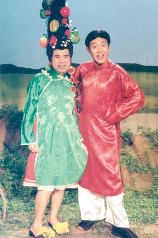 Thành Lộc bên cố NSND Bảy Nam (1913-2004) hồi năm 2002. Bà là mẹ NSND Kim Cương và là một trong những nghệ sĩ đóng góp viên gạch đầu tiên xây dựng nền cải lương Nam bộ.