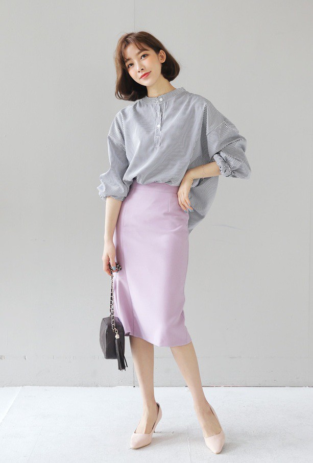 Cơ bản nhất với các nàng công sở chính là mix chân váy dài với áo sơmi. Chỉ cần chọn mẫu chân váy màu đen kinh điển, thêm 1 mẫu sơmi đơn giản là bạn đã có set đồ đẹp mắt, vừa nữ tính vừa thanh lịch.