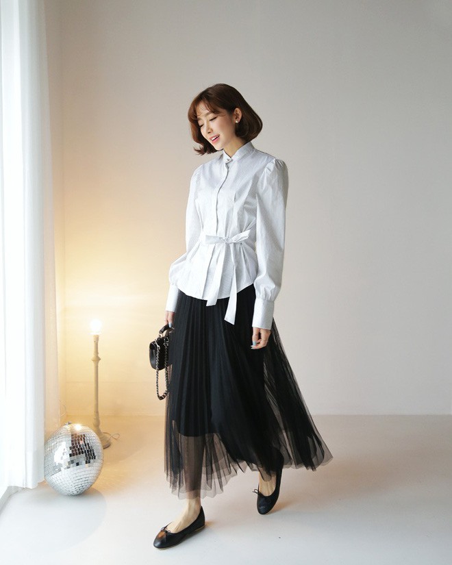 Còn nếu bạn muốn 1 set đồ vừa điệu đà, thanh lịch mà vẫn có chút phá cách thì chân váy 2 tầng vải sheer phối cùng áo sơmi thắt eo sẽ là gợi ý hoàn hảo.