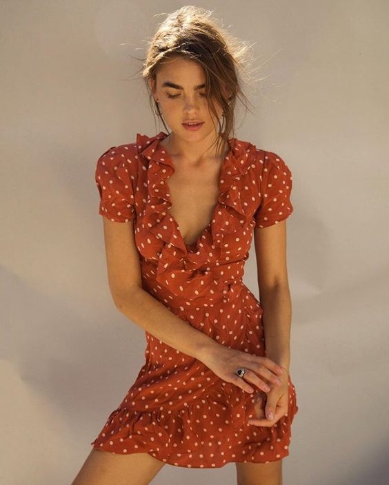 Kiểu wraparound dress được yêu thích bởi thiết kế váy trên đầu gối có nhún bèo rất nữ tính nhưng không kém phần gợi cảm.