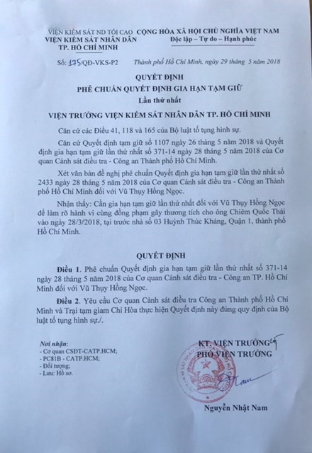 Ngày 29-5, Viện KSND TP Hồ Chí Minh phê chuẩn lệnh bắt giữ bà Vũ Thụy Hồng Ngọc để phục vụ điều tra hành vi “Cố ý gây thương tích”.
