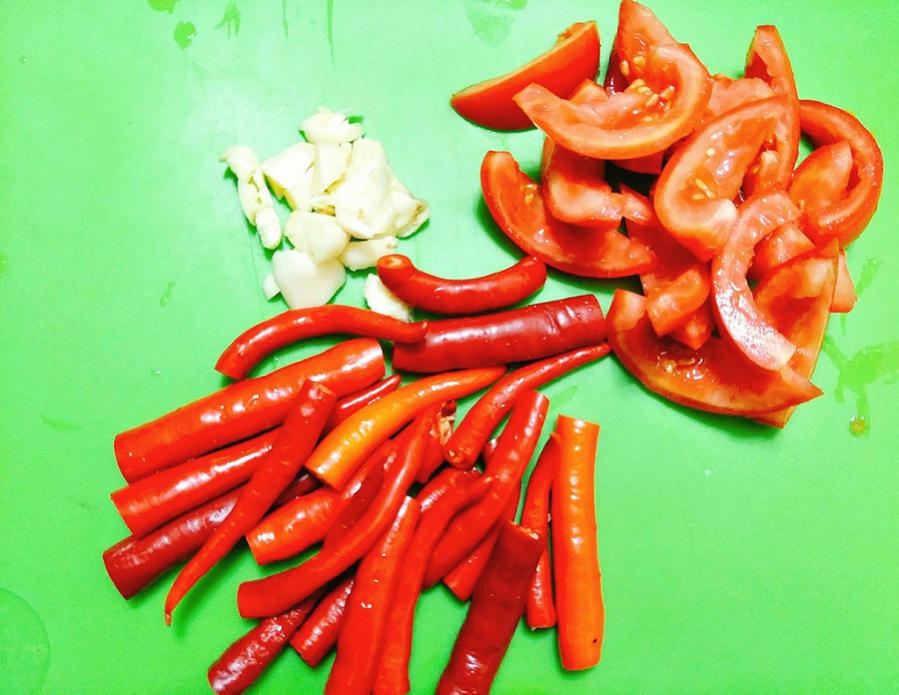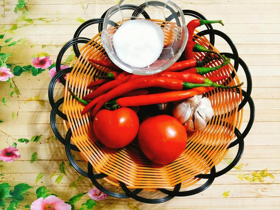 Bước 1: Bật bếp, cho 1 lượng nước vào nồi, cho ớt, phần tỏi thái nhỏ, cà chua vào nồi đun nước sôi luộc chừng 2 phút rồi vớt ra cho vào thau nước đá để giữ màu.