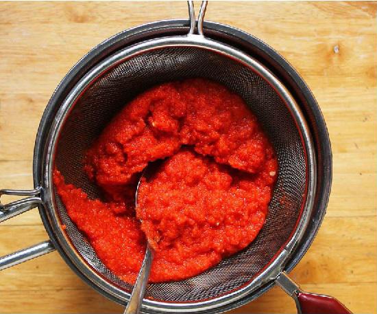 Bước 2: Sau khi cà chua nguội bớt, bạn lột vỏ, bỏ hạt cà chua. Sau đó, bạn cho tỏi thái nhỏ, ớt, cà chua vào máy xay thật nhuyễn rồi lọc qua rây lấy nước ớt mịn.
