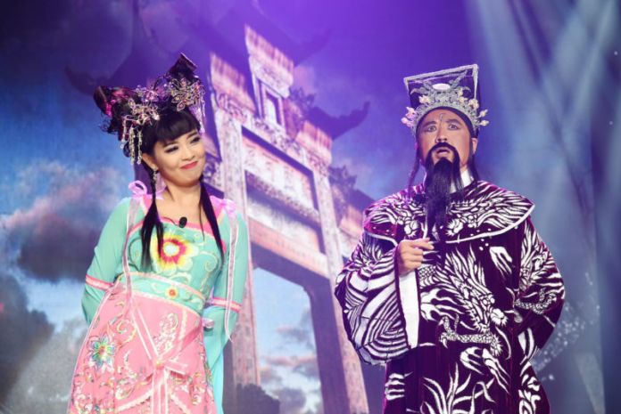 Nghệ sĩ Bảo Quốc và con gái Hồng Loan trong vở hài kịch “Bao Công Xử Án.” (Hình: Facebook Hongloan Lu)