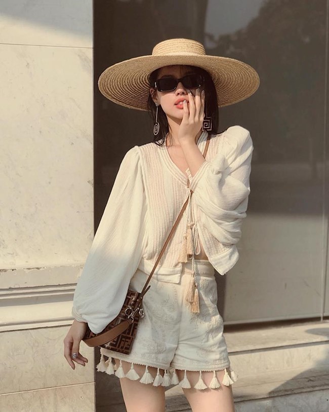 Nếu không phải là túi hiệu thì sử dụng sự bổ trợ của những chiếc nón vành tròn - rộng sẽ tạo nên phong cách đậm chất boho nếu thiết kế áo bo chun có ống tay dài như cách mà Khánh Linh thể hiện trong bức hình này.