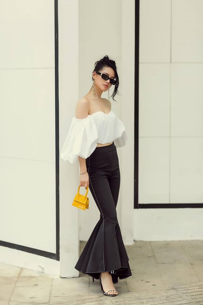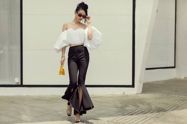Cô kết hợp cùng quần ống loe màu đen để mix cùng áo trắng, chỉ với 2 gam màu cơ bản đủ tạo nên sức hút khó rời mắt cho người đối diện.