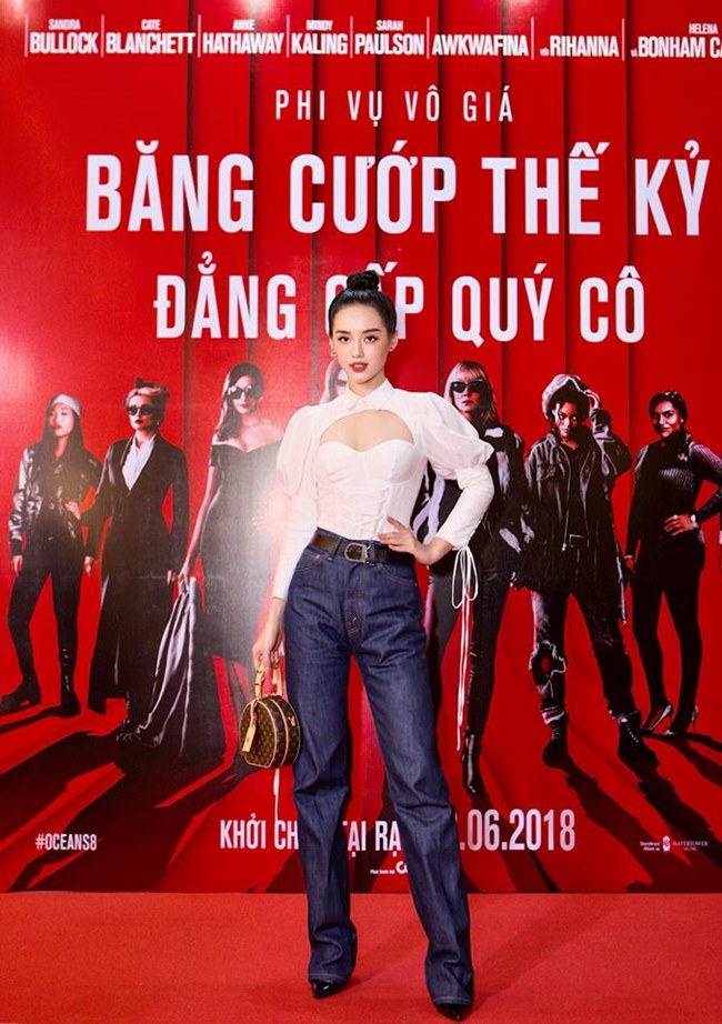 Còn đây là Khánh Linh với chiếc áo bo chun trên thảm đỏ sự kiện. Một sự kết hợp hoàn hảo với quần jean cạp cao được nhấn nhá bởi belt, tôn vòng eo kiến càng.