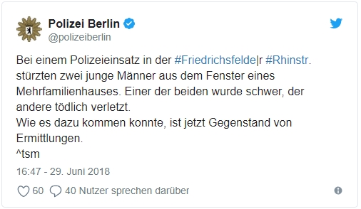 Twitter của cảnh sát Berlin thông báo về vụ việc hôm 29.6.2018