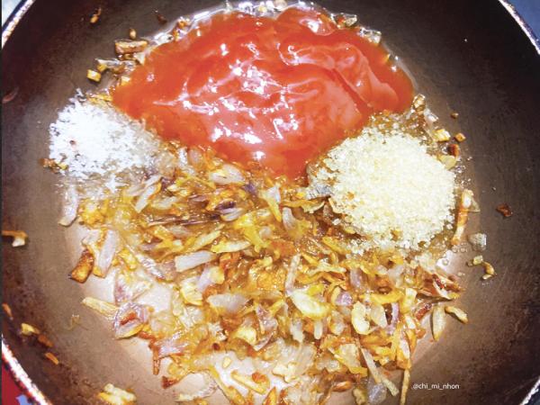 Sơ chế nước sốt: Bóc sạch vỏ hành và rửa với nước sạch. Cho hành khô vừa rửa thái nhỏ phi vàng cùng 1 thìa cà phê dầu ăn và 1/2 thìa bơ. Sau đó bạn cho 2 thìa cà phê tương ớt, 1/2 thìa cà phê đường, 1/2 thìa cà phê bột nêm cùng 2 thìa cà phê nước đun sôi. Phần sốt mỡ hành cần quấy đều trên lửa nhỏ cho đến khi nước sốt trở nên cô đặc và sánh lại.
