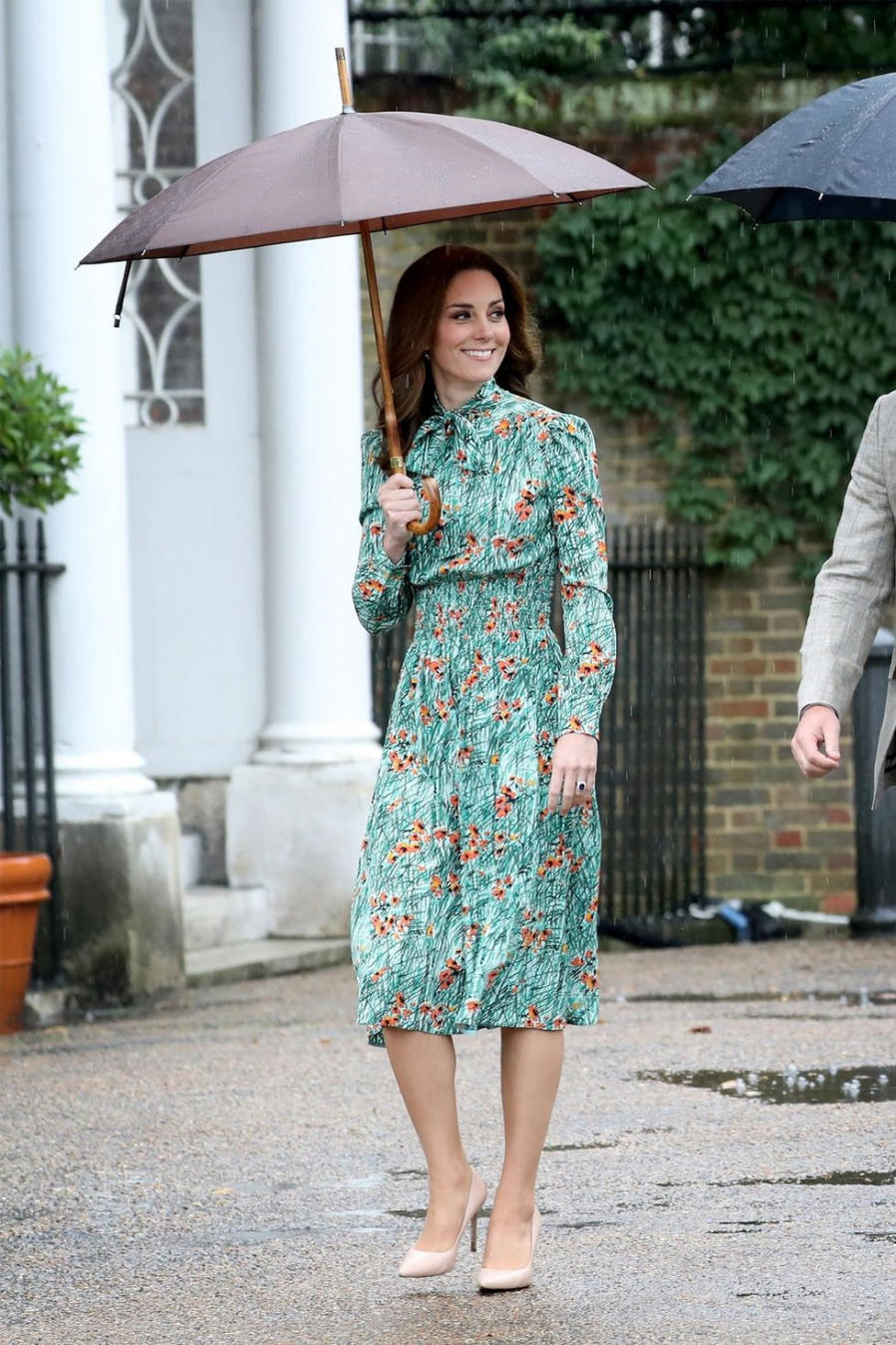 Những trang phục in hoa luôn là lựa chọn hàng đầu của Công nương Kate. Cô diện thiết kế lấy màu xanh làm chủ đạo cùng chi tiết thắt nơ nữ tính khi đến thăm khu vườn Diana Memorial. Mẫu váy của Prada có giá hơn 51 triệu đồng.