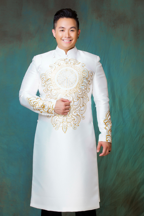 Chiếc áo dài có màu trắng ngà thay vì trắng tinh có ưu điểm phù hợp với người có vóc dáng cao to. Nhà thiết kế dựng áo dài nam theo phom áo vest với cầu vai ngang, chất liệu taffeta cứng cáp.