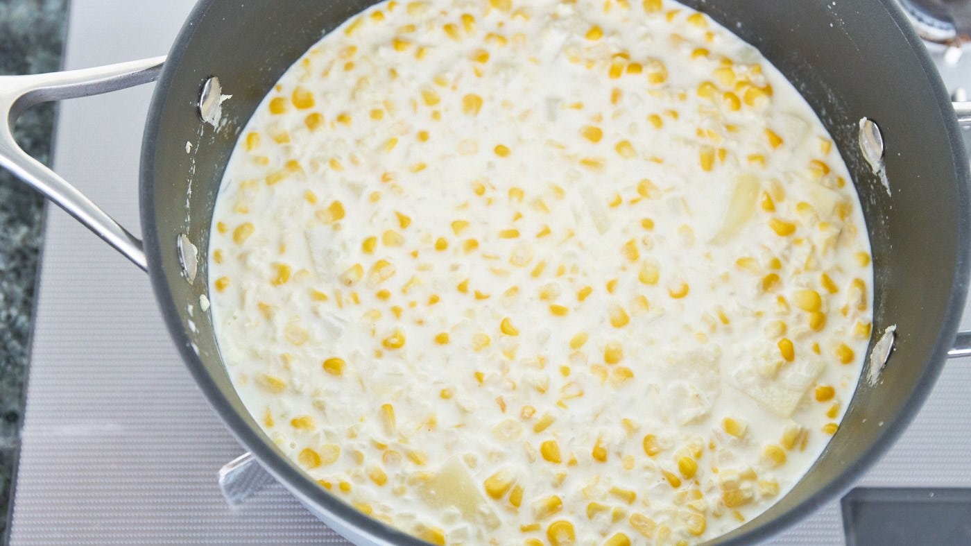 Khi hành tây đã sẵn sàng cho thêm ngô, sữa tươi, 1 muỗng cà phê muối vào. Đun nhỏ lửa cho đến khi khoai tây mềm hẳn.