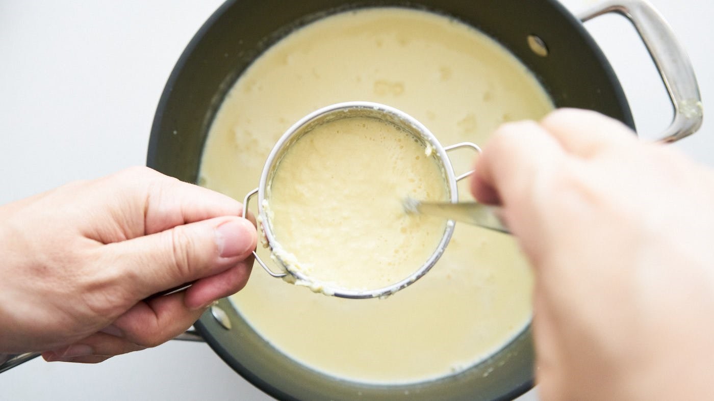 Lọc phần súp đã xay qua rây. Món súp sẽ được dùng kèm với phần bánh mì đã chuẩn bị và một ít ngò để trang trí.