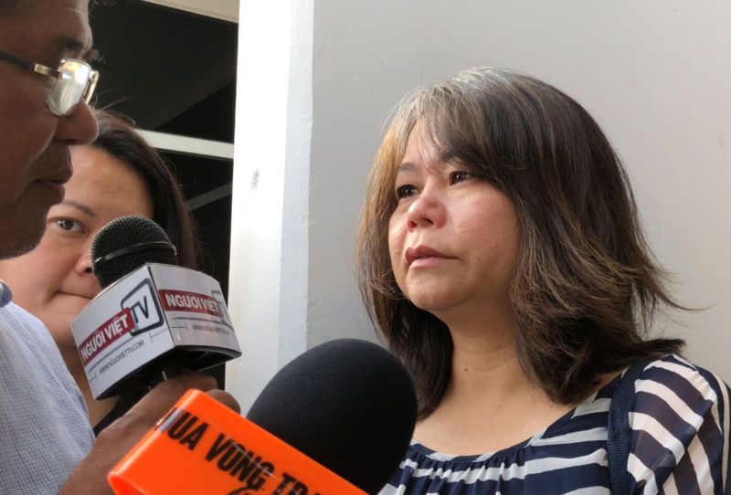 Bà Nguyễn Bảo Hiếu, vợ ông Michael Phương Minh Nguyễn, trả lời phỏng vấn của báo giới. (Hình: Nhân Phạm/Người Việt)