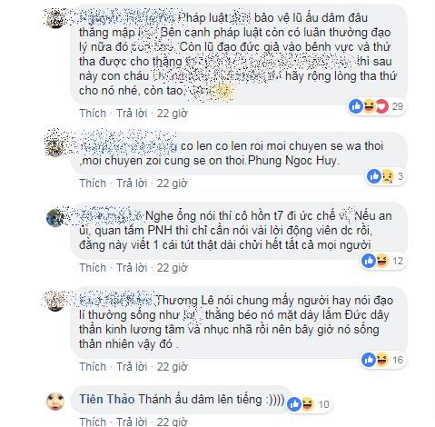 Một số người bức xúc cho rằng Minh Béo đạo đức giả: “Tui chưa lên tiếng vụ của ông bao giờ. Nhưng ông không có tư cách phán xét như vậy; Ông già ấu dâm lên tiếng, tự lo cho bản thân mình sống cho tốt đi đã kiếp này ông tu bao nhiêu cũng không trả được cái nghiệp ấu dâm đâu...”.