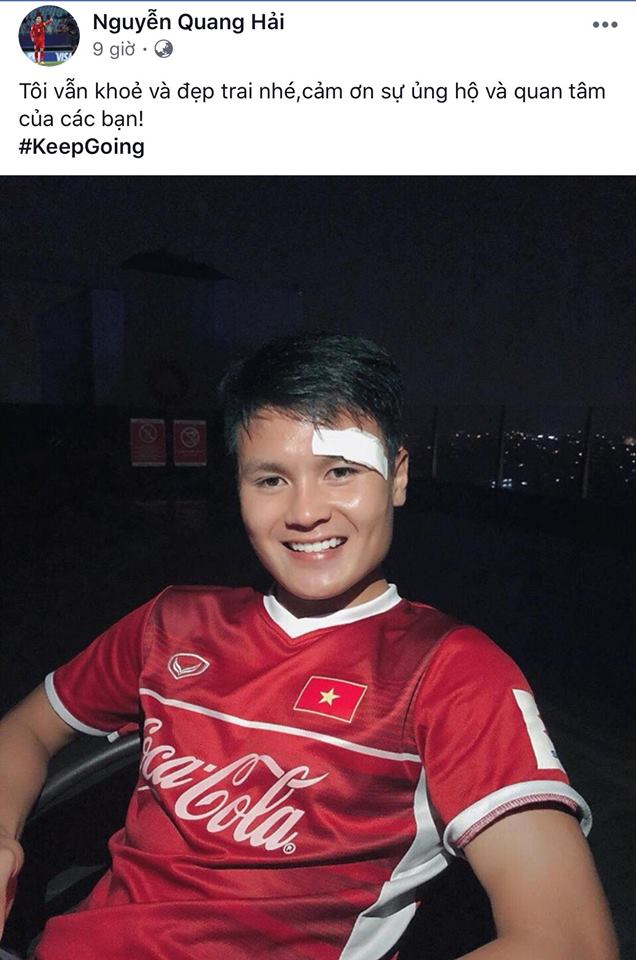 Trận đấu với U23 Syria, tiền vệ Nguyễn Quang Hải đã bị rách mí mắt, chảy máu khiến người hâm mộ lo lắng. Tuy nhiên, sau trận thắng U23 Syria, tiền vệ mang áo số 19 đã “trấn an” người hâm mộ bằng dòng trạng thái dễ thương: “Tôi vẫn khoẻ và đẹp trai nhé, cảm ơn sự ủng hộ và quan tâm của các bạn!”