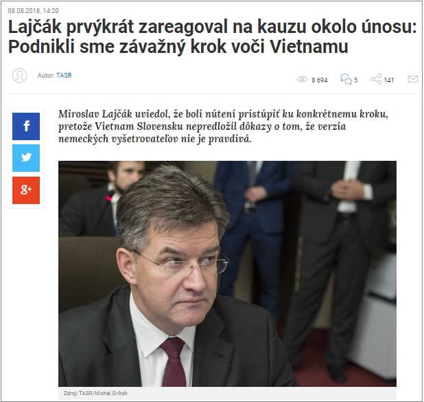 Bài tường thuật của tờ báo mạng Noviny.sk mang tiêu đề „Ngoại trưởng Lajcak xác nhận, Bộ Nội vụ Slovakia khai báo với phía Ba Lan rằng Bộ trưởng Kalinak bay trên chuyên cơ của chính phủ“ đã nhấn mạnh: „Trong vụ một công dân Việt Nam bị bắt cóc, sự kiện mới được phát hiện. Vào giờ phút cuối, Slovakia đã thay đổi yêu cầu của mình để bay ngang qua lãnh thổ Ba Lan và nói rằng Bộ trưởng Nội vụ Kalinak có mặt trên chiếc chuyên cơ. Bộ trưởng Ngoại giao Miroslav Lajčák xác nhận như vậy khi trả lời các câu hỏi của các thành viên của Ủy ban Đối ngoại của Quốc hội CH Séc. Các đảng đối lập ở Slovakia nói: Chúng ta đã lừa dối người Ba Lan, và chúng ta đã phá vỡ lòng tin“.