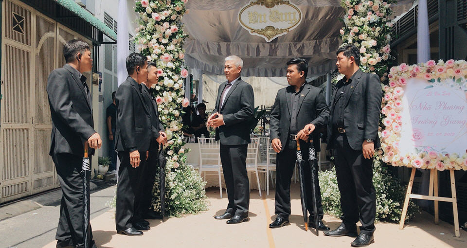 Tùng Yuki trao đổi với người nhà cô dâu về phương án đón tiếp khách mời và khu vực đậu xe.