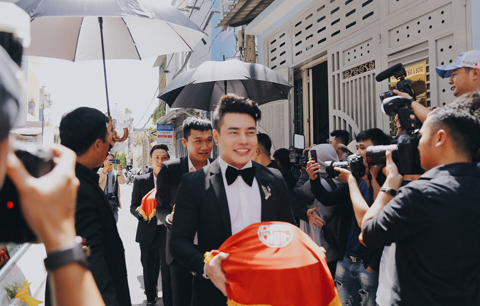 Đoàn nhà trai gồm 10 người đến đón dâu. Ba chú rể dẫn đầu, luôn tươi cười với mọi người. Trong khi đó nam diễn viên hài nhắc nhở bạn bè không livestream khi dự lễ.