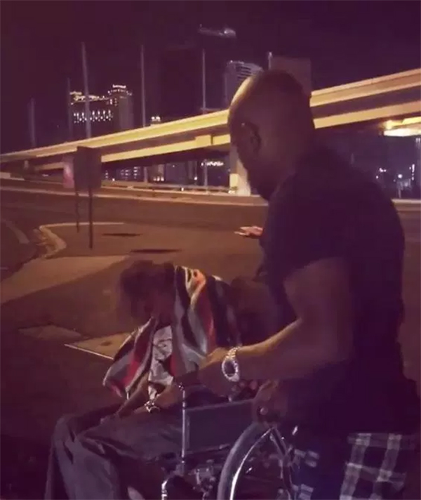 Mayweather mang tiền tặng một người đàn ông ngủ trên xe lăn gặp trên đường. Ảnh: Instagram.