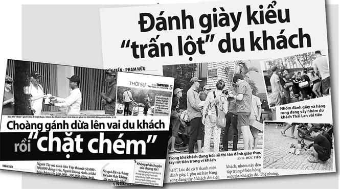 Thời gian gần đây đã xảy ra không ít các trường hợp khách tây bị đội ngũ đánh giày, bán dừa...móc hầu bao của họ 1 cách không khai như kiểu trấn lột. Đây chính là lỗi buông lỏng quản lý của cơ quan chức năng và ý thức yếu kém của những con người này đối với khách nước ngoài. Họ có thể lấy tiền của khách tây xong đây chính là hành vi bán rẻ hình ảnh của đất nước.Hàng trăm ý kiến bạn đọc bức xúc về tình trạng đánh giày, bán dừa, hàng rong “trấn lột” du khách, lo ngại thực trạng này không chỉ ảnh hưởng đến du lịch mà còn làm hình ảnh người Việt xấu xí trong mắt du khách.
