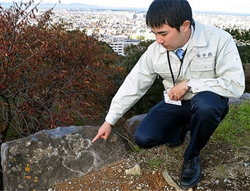 Một trong các phiến đá thuộc Thành cổ Yonago, Nhật Bản bị viết, vẽ bậy lên bằng tiếng Việt. Ảnh: Asahi.