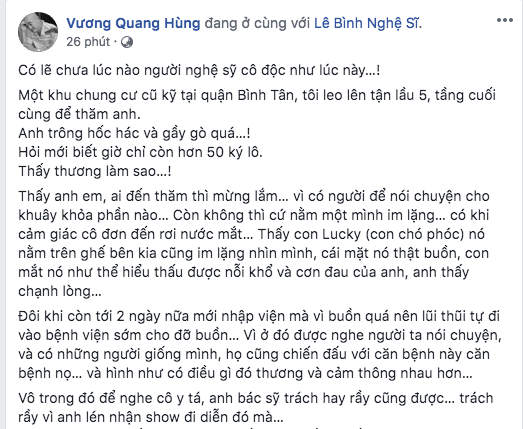 Nghệ sĩ Lê Bình luôn thể hiện tinh thần lạc quan trước sự quan tâm của công chúng và đồng nghiệp. Thế nhưng, mới đây, đạo diễn Vương Quang Hùng (phim "Đời như ý"), một người bạn thân của nghệ sĩ Lê Bình, đã có dòng chia sẻ đầy xúc động về ông. Qua đó, khán giả thấy được nghệ sĩ Lê Bình cô độc đến nhường nào khi chiến đấu với căn bệnh quái ác.
