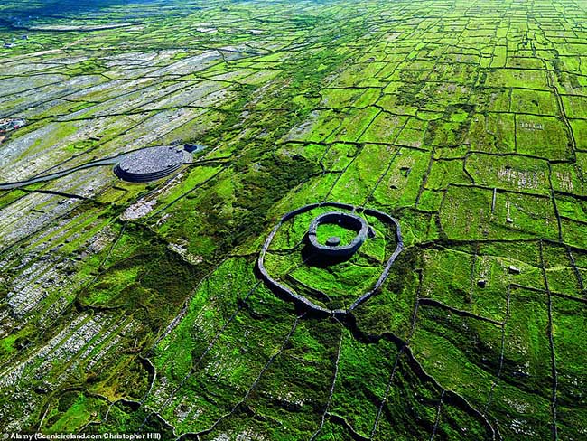 Pháo đài vòng đá của Dun Eochla, trong ảnh, đứng trên Inishmore, hòn đảo lớn nhất của Quần đảo Aran trong Vịnh Galway. Pháo đài được xây dựng vào khoảng năm 550, 800 AD và được xây dựng bằng đá khô. Quần đảo Aran có một số công sự tương tự được xây dựng từ đầu năm 1.000 trước Công nguyên.