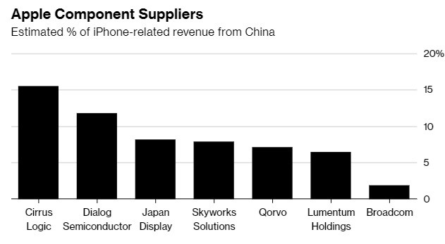 Tỷ lệ doanh thu từ iPhone của một số nhà cung cấp linh kiện, dựa theo số liệu iPhone bán ra tại thị trường Trung Quốc. Ảnh: Bloomberg.