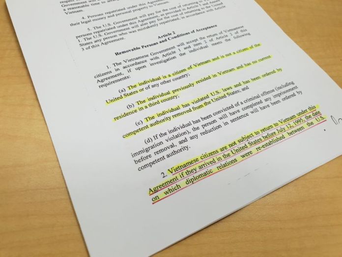 Thỏa thuận giữa chính phủ Hoa Kỳ và nhà cầm quyền Việt Nam vào năm 2008 là Việt Nam không nhận những người tị nạn Cộng Sản bị trả về lại Việt Nam nếu họ đã đến Hoa Kỳ trước ngày 12 Tháng Bảy, 1995. (Đằng-Giao)
