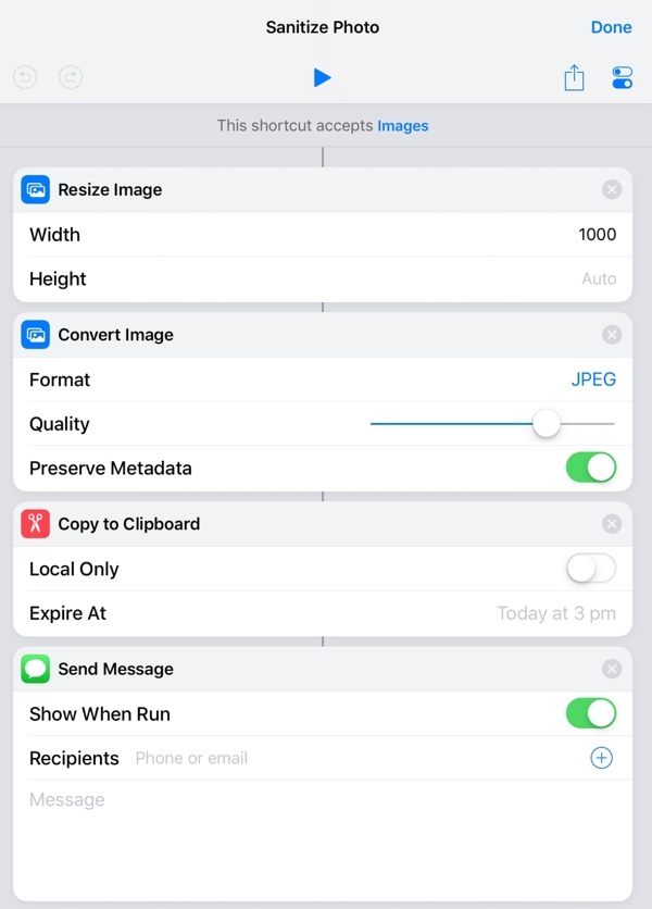 Bản thân phím tắt này rất đơn giản. Nó lấy ảnh, giảm kích thước, sau đó chuyển định dạng ảnh sang JPG. Trong quá trình chuyển đổi định dạng sang JPG, nó cung cấp cho bạn tùy chọn Preserve Metadata. Bạn chỉ cần bỏ dấu chọn tại mục này là có thể xóa thông tin siêu dữ liệu.