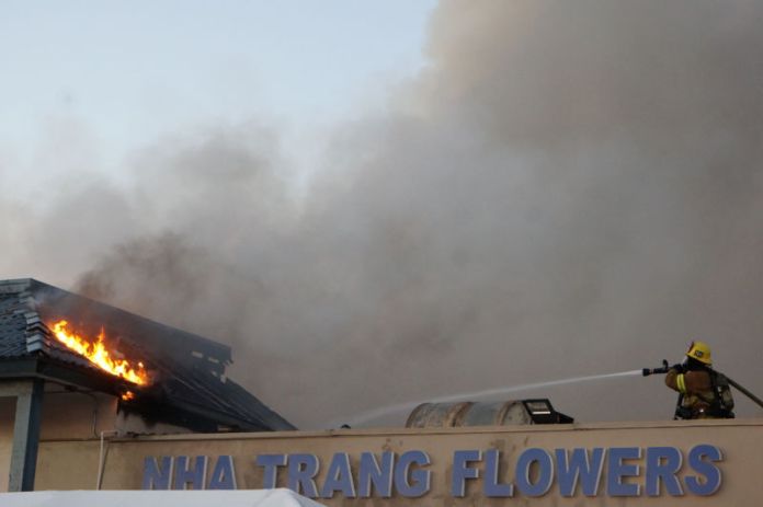 Ngọn lửa từ tiệm Tiếng Thu, sau đó cháy lan lên gác, qua các tiệm khác như LD Auto Service và Nha Trang Flowers. (Hình: Dân Huỳnh/Người Việt)