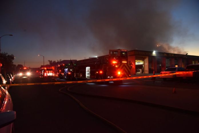 Ngọn lửa đầu tiên bốc lên từ tiệm Tiếng Thu bán nhang đèn, vàng mã nhìn ra đường Bishop, góc với đường Moran, và gần tiệm LD Auto Service. (Hình: Văn Lan/NV)