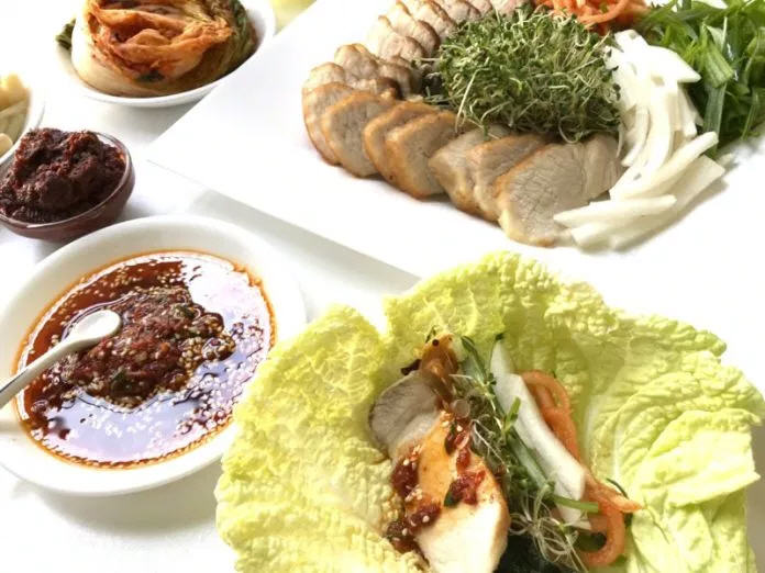 Một món ngon làm từ heo của Nam Hàn là món thịt luộc cuốn rau cải, gọi là “bossam.” Món này tựa như thịt luộc cuốn bánh tráng của người Việt Nam vì cũng là thịt luộc. Thịt ba chỉ được luộc với nước tương và các loại gia vị, sau đó được cuốn vào lá sà lách, kèm theo tỏi sống, tương ớt và kimchi rất ngon miệng, ăn một miếng thật lớn, rồi ngốn trong miệng lại càng ngon hơn.