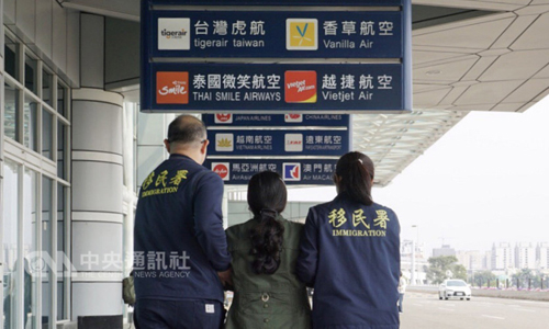 Cơ quan di trú Đài Loan đưa nữ du khách Việt Nam ra sân bay quốc tế Cao Hùng hôm 29/1. Ảnh: CNA.