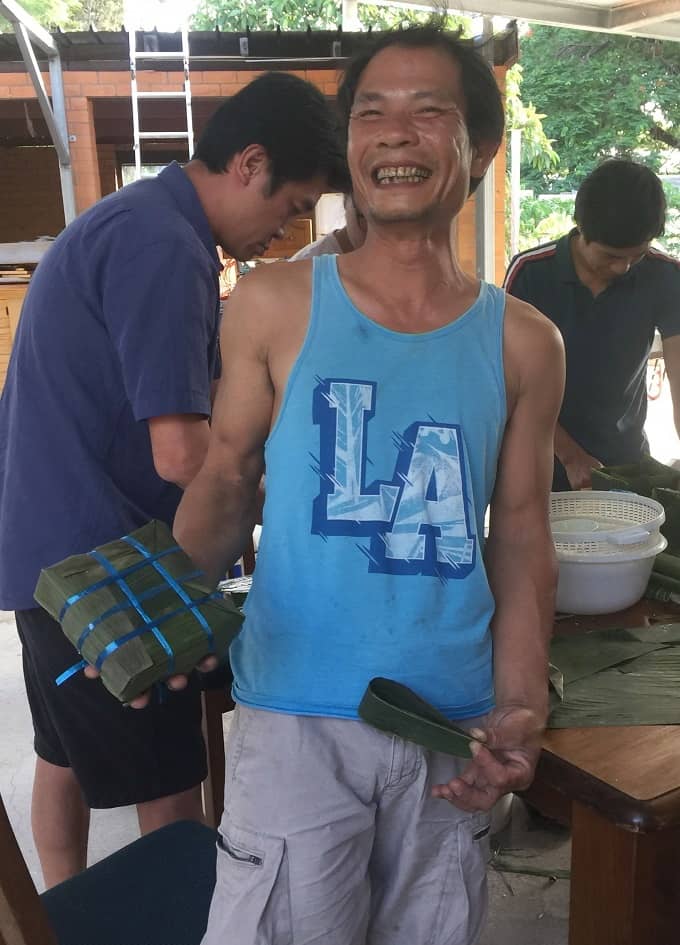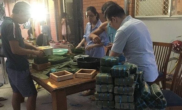 Hai bên – nam có nữ có, mọi người đang mân mê từng mảng lá. Thử xếp vào khung rồi lấy ra xếp vào. Những động tác không thuần thục cho thấy đây không phải là những người gói bánh chuyên nghiệp. Có lẽ khi tha hương, hình ảnh quê nhà đã khiến cho ai nấy cũng náo nức, muốn tự tay mình tạo ra một sản phẩm cho ngày Tết.