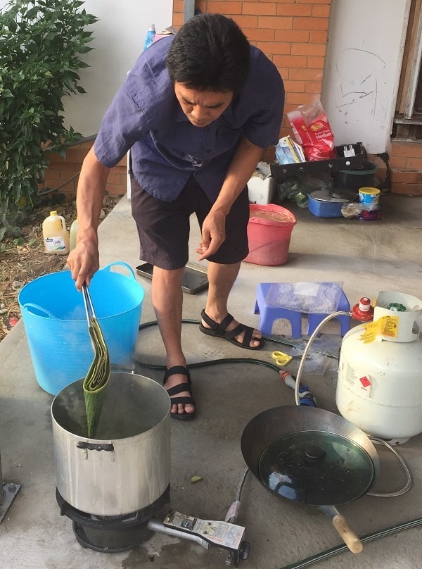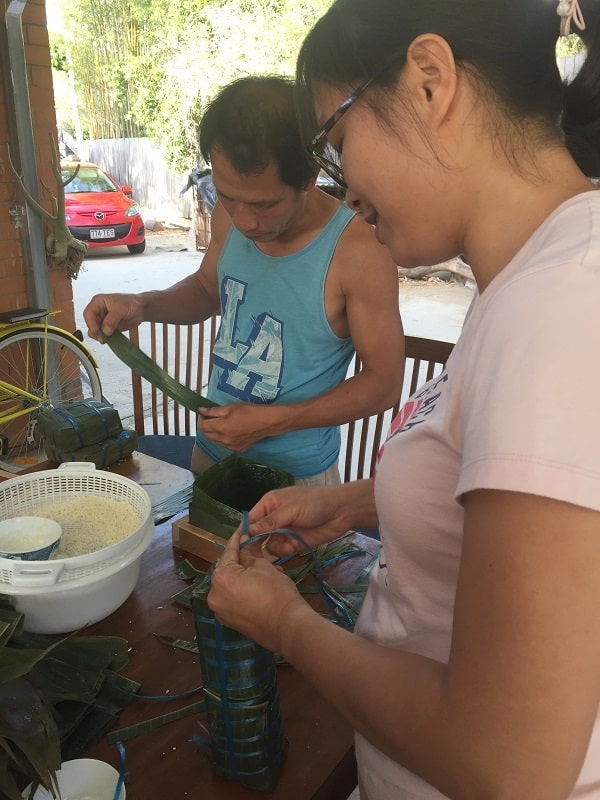 Những chiếc bánh tiếp tục hình thành. Nhìn các anh gói mới thấy, bánh ở Úc rất khó gói bởi ở đây nguồn lá vô cùng đắt đỏ. Chất lượng của lá không tốt như lá ở Việt Nam.