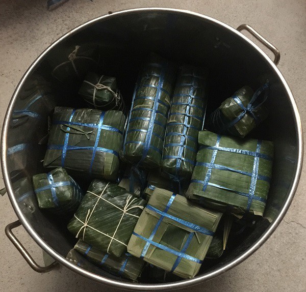 Những chiếc bánh chưng gói vội bởi những bàn tay không chuyên được sắp vào thùng. Bánh được xếp thành từng lớp ngay ngắn. Những cây bánh tét được tận dụng để lấp đầy những khoảng trống trong thùng. Một lớp lá đậy bên trên. Nước được châm đầy.