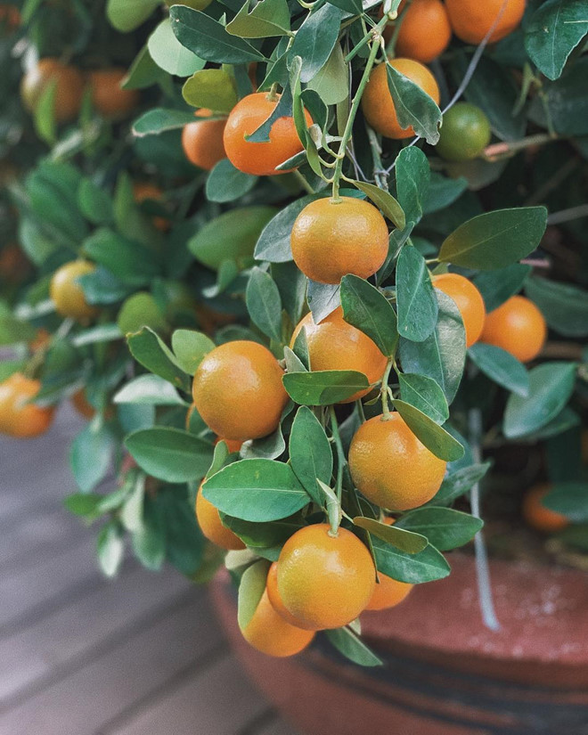 Trong bộ cây cảnh chơi Tết không thể thiếu một cành quất, với chùm quả trĩu nặng.