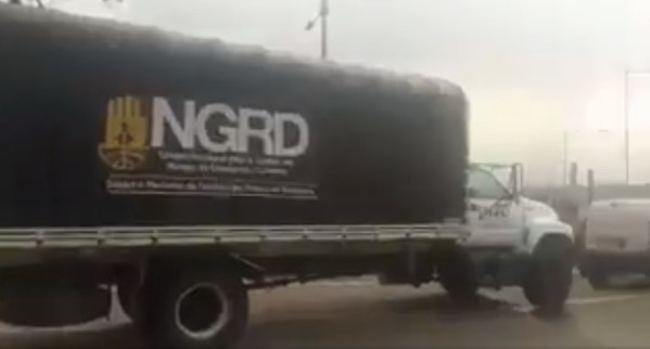 Một chiếc xe tải viện trợ từ NGRD (National Unit for Disaster Risk Management) (Đơn vị quản lý rủi ro thiên tai) của Colombia ở biên giới Venezuela. Chiếc xe tải phải quay về vì không thể vào Venezuela.